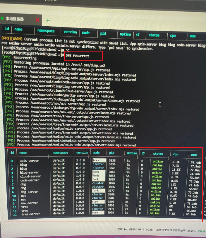 pm2 resurrect // 在系统重启后,你可以运行以下命令来重新启动之前保存的PM2进程状态